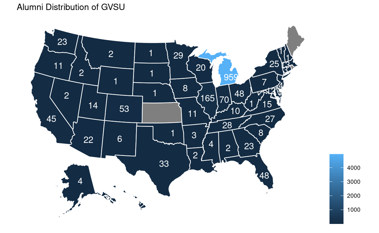 The map below shows the number of GVSU alumni as distributed in the different states of USA.