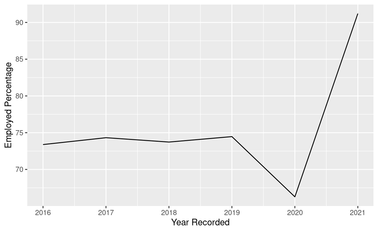 This is a time series analysis of the number of employed GVSU graduates from 2016 to 2021.